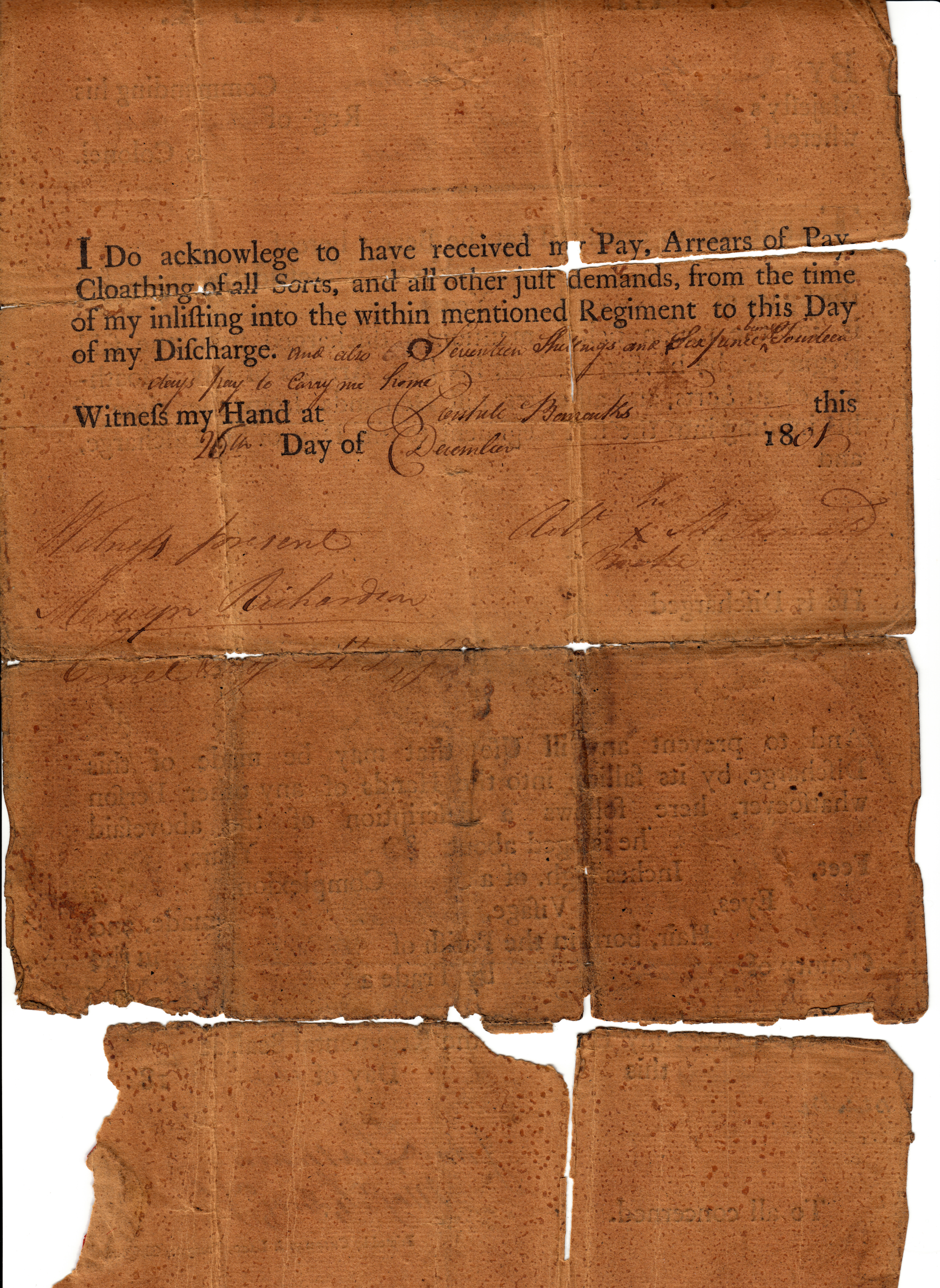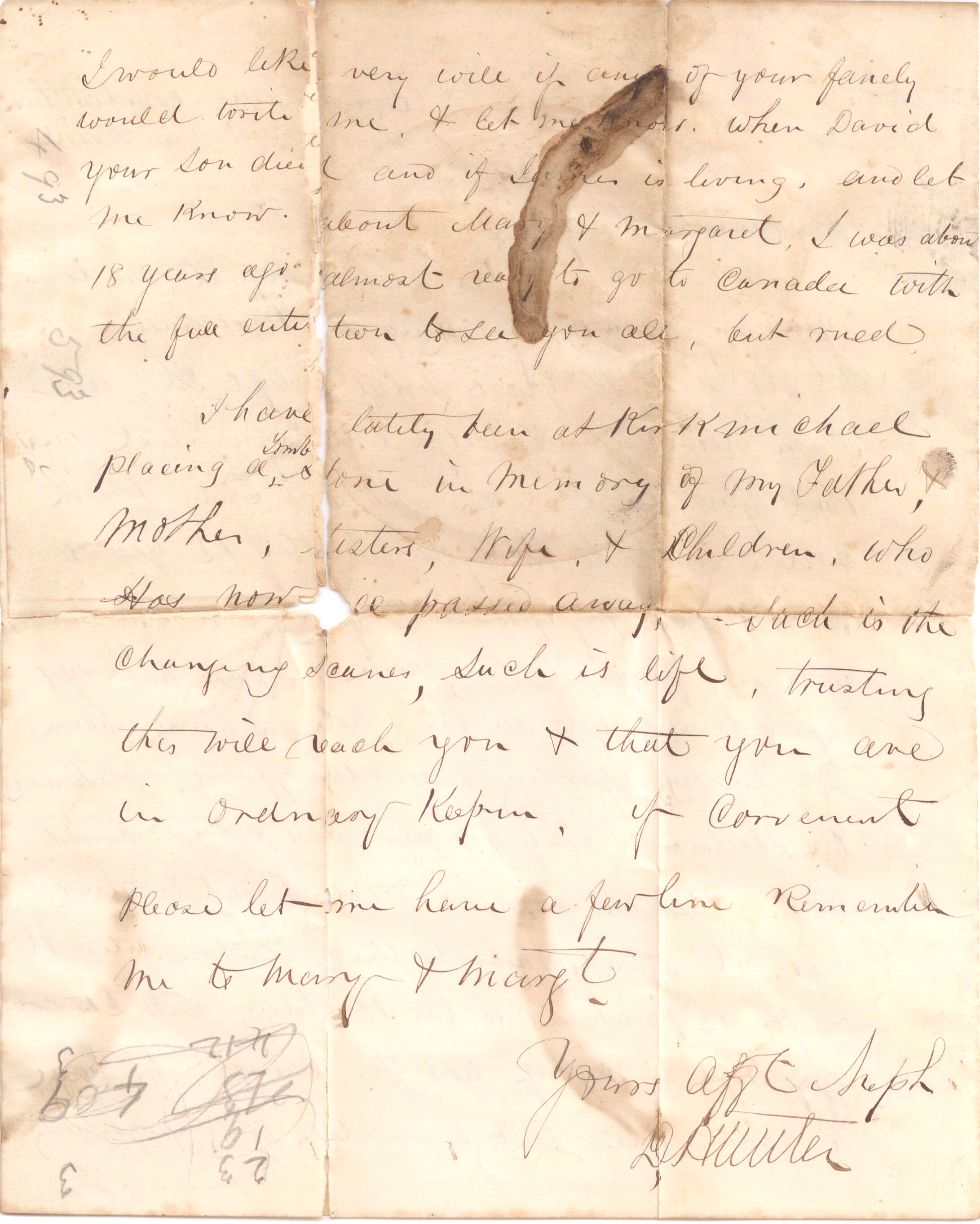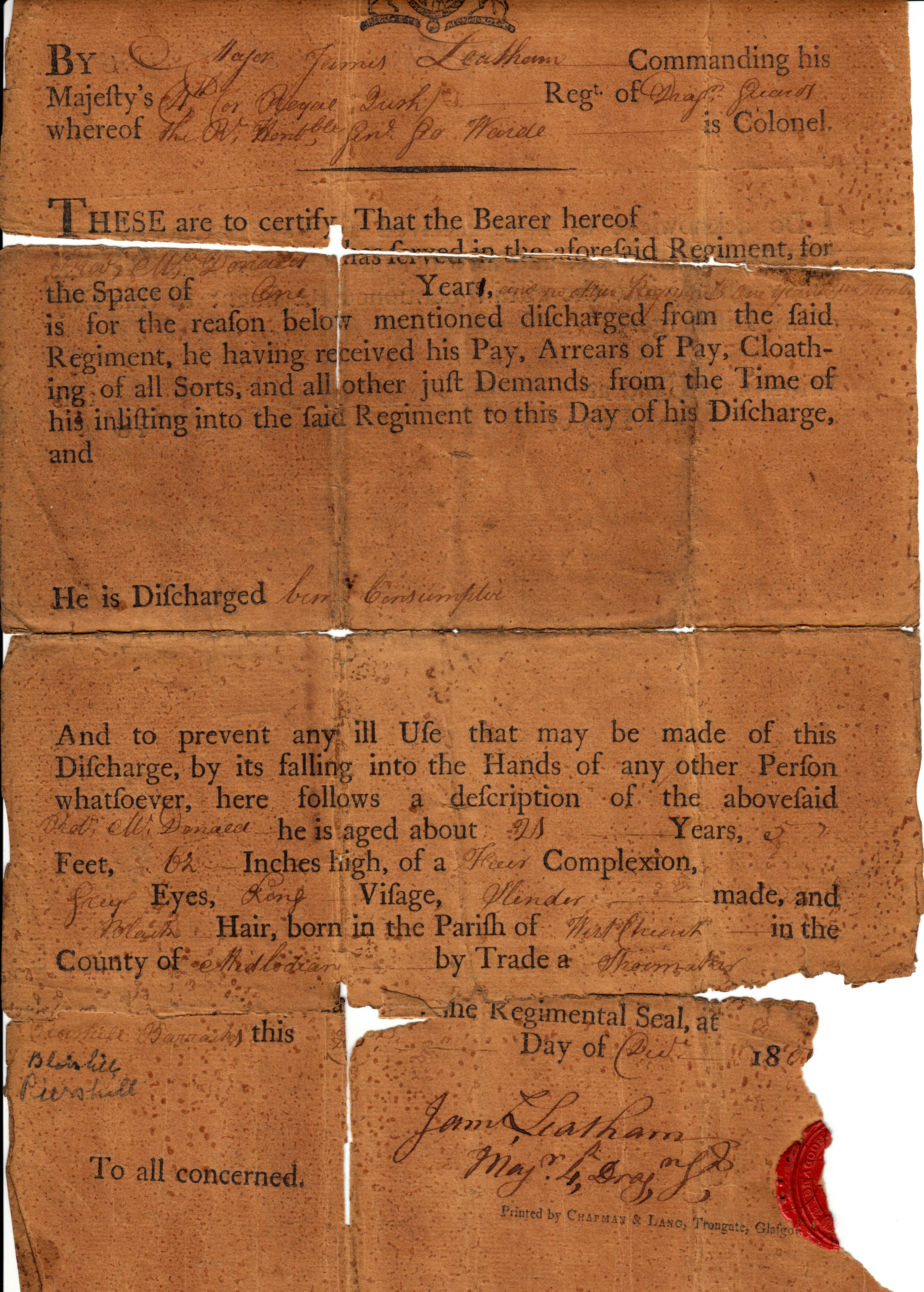 Robert MacDonald (all this stuff is in an envelope with his name on it) - R. M. discharge papers 1804 from Perthshire Regiment of North British Militia; gives birthplace [scanned original] - Western Regiment, Mid-Lothian Volunteer Infantry: Terms of Service 1808 [scanned original] - R. M. discharge papers from some Dragoon Guards regiment, 1801; gives a physical description of him and lists a different birthplace from the other [page 1 · page 2]Angus McDonald - letter from ? Quebec, Sept. 20, 1852; informing him of his appointment as Justice of the Peace for the district of Quebec - letter from Hector Langevin, Aug. 28, 1857 wanting to meet with A. M. about the property at Lorette prior to its sale the following week - membership card to English, Irish & Scotch Paper Makers, 4th of ? 1830 [scanned image] - letter from his mother Jean Smith, April 14, 1836: speaks of coming to Canada [scanned original · transcript] - receipt from Mount Hermon Cemetery, Sept ? 1859; something about a vault? - The Canada Gazette #589, Quebec Sept 18, 1852; lists A. M. 's appointment as a J. P. - letter from Gibson Craig Smith in Glasgow Dec 11 1873 - numerous letters from nephew William Miller to Angus in Thorold, all on Rice Brothers letterhead; 1880: Oct 7; 1881: April 27, May 20, Sept 2; 1882: July 24; 1884: April 19, June 25, Nov 15; also one reply to him from Angus (copy?) dated April 22, 1884. - May 10 & 11, 1849; Procès verbal de ligne qui devise les terres des sieurs Angus McDonald et Noël Marcotte. 3e concession. 1re expédition. Seems to be a notarized document. - receipt Oct 23 1849 for funeral of the late John Smith (small bag) - letter from Charles ? Feb 9 1850 Cap Santé (small bag) - receipt from Mount Hermon Cemetary Aug 12 1873 re: burying Peter Smith (small bag) - letter from C. I. Tessier, Quebec: Jan 27 1854 (small bag)Mary Hunter Aird - found inside an envelope addressed to Kate Dalgleish in Thorold postmarked Edinburgh Sept 26 1887:Catherine McDonald/Kate Dalgleish - marriage certificate: William Dalgleish & Catherine McDonald; January 13, 1865; witnesses: Joseph and Isabella FordWilliam Dalgliesh - apprenticeship papers for William Dalgleish to Bartley & Dunbar Feb 20, 1855George Dalgleish - telegram to him at 14 Overdale Ave.; Feb 11? 1901 from Waterloo Quebec Station about his uncle "Mr. Ford's" deathAngus Dalgleish - certificate indicating he passed the entrance exam required to enter a "Collegiate Institute or High School" Jan? 29 1896Edith Dalgleish - diploma from McGill Normal School for Elementary School teaching, July 1 1870Typewritten transcriptions of various documents Abstracts of Registration on Lots 74, 75, 76, 77 of the township of Thorold, County of Welland (Margaret Logan McDonald's land?) Letter to Thomas A. Begley, Esq., Department of Public Works, from engineer A. Barrett dated Oct. 26, 1846; about the building of the bridge at Jacques Cartier; looks like maybe a copy The Quebec Gazette, Thursday June 21 1764 - seems old but not that old, perhaps a reproduction?Some letter correcting an article in the Montreal Gazette; no date or signature (found in the Robert McDonald envelope) Petition to British government from J. P. Lecourt about 1849 re: the Catholic Arch Bishop of Quebec (small bag) Letter from N. F. Belleau? July 10 1854 (small bag) Letter from Willie Ford to his brother Joey Aug 16 1915 from England (small bag) J. E. Tremblé envelope (small bag) - a bunch of paper that was used as envelopes - nothing in themTypewritten program for graduation exercises Agriculture 1913, MacDonald College (small bag) Receipts for payment of one share held by G. S? Pierce in the Quebec Protestant Cemetery Association (small bag) Letter to C. E. Casgrain, Commissioner of Public Works from A. Barrett - 24 Oct 1846, Montréal (small bag) | |