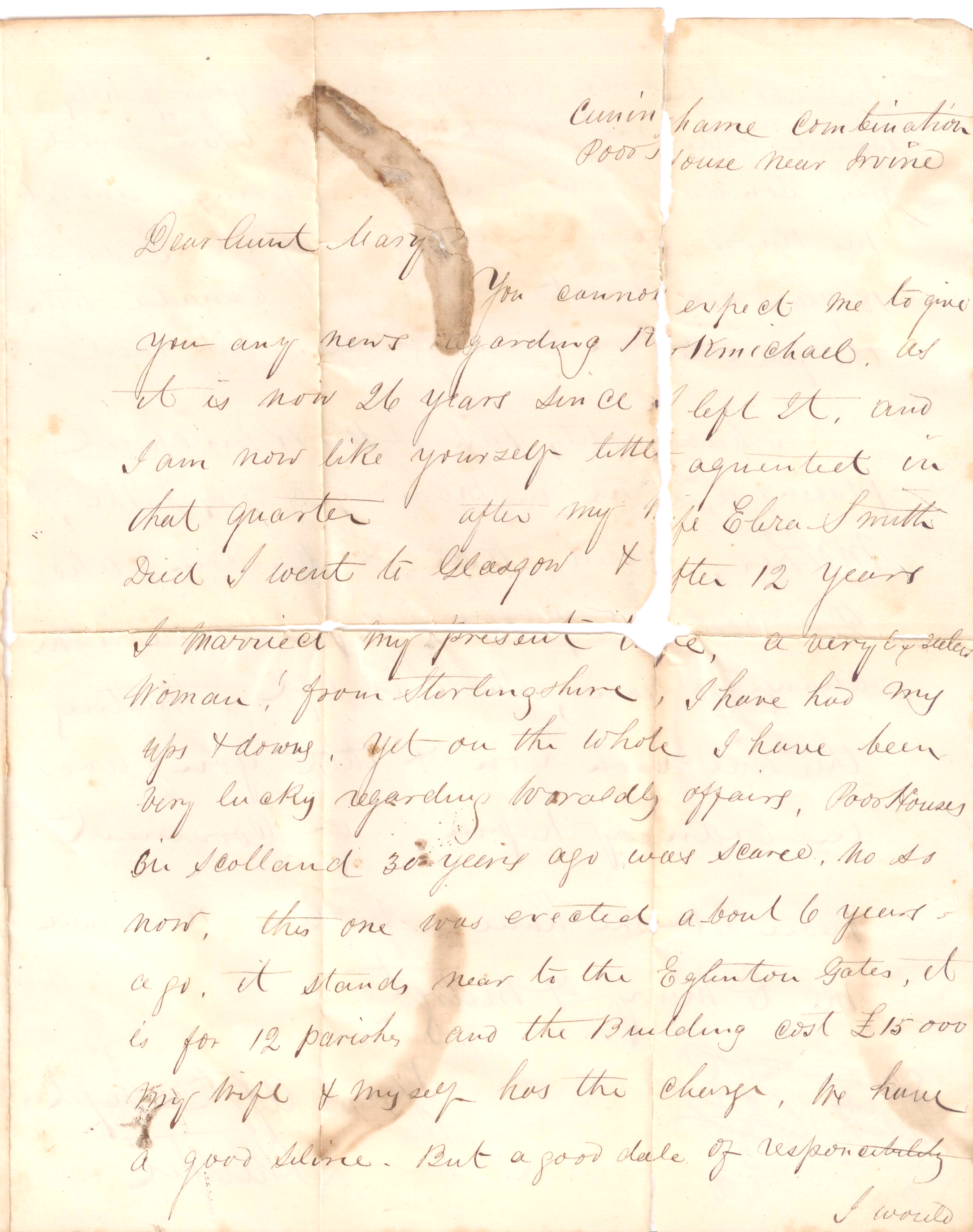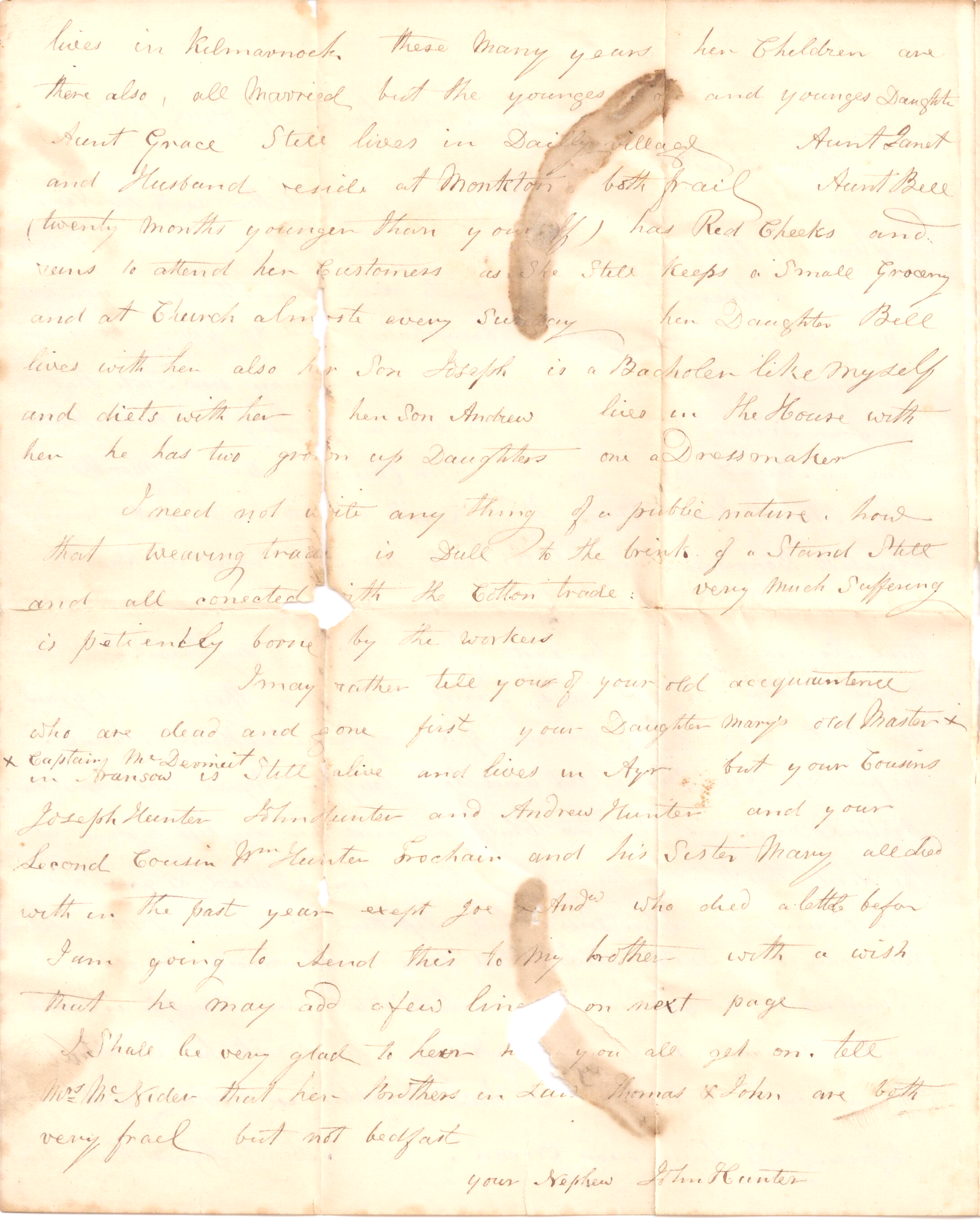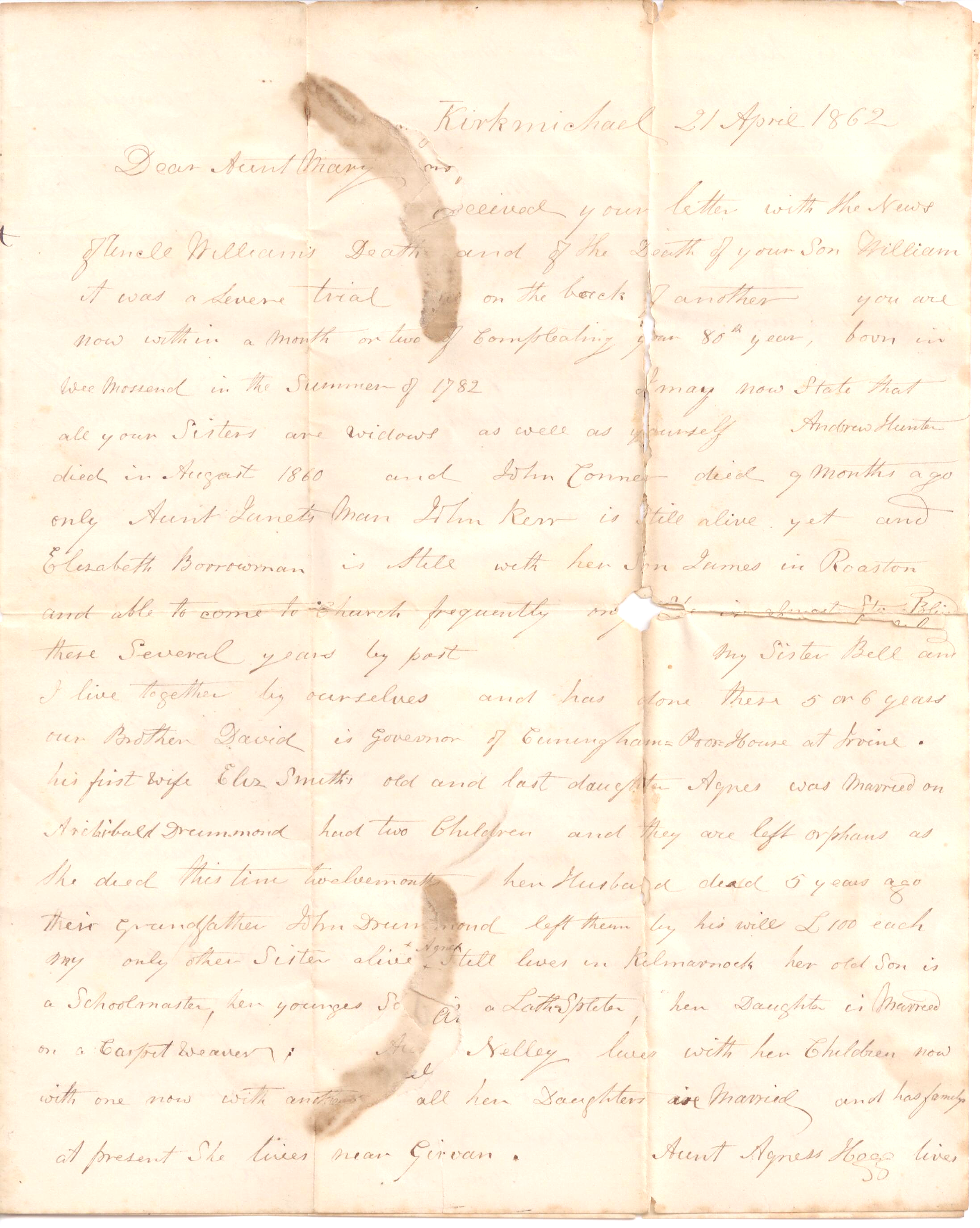 Robert MacDonald (all this stuff is in an envelope with his name on it) - R. M. discharge papers 1804 from Perthshire Regiment of North British Militia; gives birthplace [scanned original] - Western Regiment, Mid-Lothian Volunteer Infantry: Terms of Service 1808 [scanned original] - R. M. discharge papers from some Dragoon Guards regiment, 1801; gives a physical description of him and lists a different birthplace from the other [page 1 · page 2]Angus McDonald - letter from ? Quebec, Sept. 20, 1852; informing him of his appointment as Justice of the Peace for the district of Quebec - letter from Hector Langevin, Aug. 28, 1857 wanting to meet with A. M. about the property at Lorette prior to its sale the following week - membership card to English, Irish & Scotch Paper Makers, 4th of ? 1830 [scanned image] - letter from his mother Jean Smith, April 14, 1836: speaks of coming to Canada [scanned original · transcript] - receipt from Mount Hermon Cemetery, Sept ? 1859; something about a vault? - The Canada Gazette #589, Quebec Sept 18, 1852; lists A. M. 's appointment as a J. P. - letter from Gibson Craig Smith in Glasgow Dec 11 1873 - numerous letters from nephew William Miller to Angus in Thorold, all on Rice Brothers letterhead; 1880: Oct 7; 1881: April 27, May 20, Sept 2; 1882: July 24; 1884: April 19, June 25, Nov 15; also one reply to him from Angus (copy?) dated April 22, 1884. - May 10 & 11, 1849; Procès verbal de ligne qui devise les terres des sieurs Angus McDonald et Noël Marcotte. 3e concession. 1re expédition. Seems to be a notarized document. - receipt Oct 23 1849 for funeral of the late John Smith (small bag) - letter from Charles ? Feb 9 1850 Cap Santé (small bag) - receipt from Mount Hermon Cemetary Aug 12 1873 re: burying Peter Smith (small bag) - letter from C. I. Tessier, Quebec: Jan 27 1854 (small bag)Mary Hunter Aird - found inside an envelope addressed to Kate Dalgleish in Thorold postmarked Edinburgh Sept 26 1887:Catherine McDonald/Kate Dalgleish - marriage certificate: William Dalgleish & Catherine McDonald; January 13, 1865; witnesses: Joseph and Isabella FordWilliam Dalgliesh - apprenticeship papers for William Dalgleish to Bartley & Dunbar Feb 20, 1855George Dalgleish - telegram to him at 14 Overdale Ave.; Feb 11? 1901 from Waterloo Quebec Station about his uncle "Mr. Ford's" deathAngus Dalgleish - certificate indicating he passed the entrance exam required to enter a "Collegiate Institute or High School" Jan? 29 1896Edith Dalgleish - diploma from McGill Normal School for Elementary School teaching, July 1 1870Typewritten transcriptions of various documents Abstracts of Registration on Lots 74, 75, 76, 77 of the township of Thorold, County of Welland (Margaret Logan McDonald's land?) Letter to Thomas A. Begley, Esq., Department of Public Works, from engineer A. Barrett dated Oct. 26, 1846; about the building of the bridge at Jacques Cartier; looks like maybe a copy The Quebec Gazette, Thursday June 21 1764 - seems old but not that old, perhaps a reproduction?Some letter correcting an article in the Montreal Gazette; no date or signature (found in the Robert McDonald envelope) Petition to British government from J. P. Lecourt about 1849 re: the Catholic Arch Bishop of Quebec (small bag) Letter from N. F. Belleau? July 10 1854 (small bag) Letter from Willie Ford to his brother Joey Aug 16 1915 from England (small bag) J. E. Tremblé envelope (small bag) - a bunch of paper that was used as envelopes - nothing in themTypewritten program for graduation exercises Agriculture 1913, MacDonald College (small bag) Receipts for payment of one share held by G. S? Pierce in the Quebec Protestant Cemetery Association (small bag) Letter to C. E. Casgrain, Commissioner of Public Works from A. Barrett - 24 Oct 1846, Montréal (small bag) | |